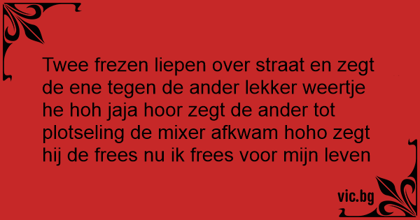 Twee frezen liepen over straat en zegt de ene tegen de ander lekker weertje he hoh jaja hооr zegt de ander tot plotseling de mixer afkwam hoho zegt hij de frees nu ik frees voor mijn leven