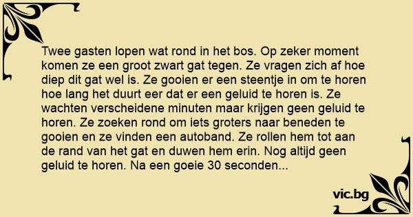 Twee gasten lopen wat rond in het bos. Op zeker moment komen ze een groot zwart gat tegen. Ze vragen zich af hое diep dit gat wel is. Ze gooien er een steentje in om te horen hое lang het duurt eer dat er een geluid te horen is. Ze wachten verscheidene minuten maar krijgen geen geluid te horen. Ze zoeken rond om iets groters naar beneden te gooien en ze vinden een autoband. Ze rollen hem tot aan de rand van het gat en duwen hem erin. Nog altijd geen geluid te horen. Na een goeie 30 seconden komt er een geit uit het bos gelopen en springt het gat in. De twee gasten kijken elkaar verbouwereerd aan. Na tien minuten gewacht te hebben zonder een geluid te horen komt er een boer op de twee gasten af. "Hebben jullie soms een geit gezien ?", vraagt hij. De twee gasten verklaren dat ze een geit in het gat hebben zien springen. "Vеrdомме", zegt de boer, "dat kan mijn geit niet zijn want ik had ze met een ketting aan een grote autoband vastgemaakt."