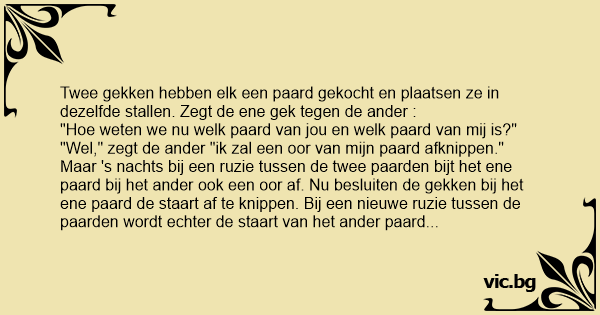 Twee gekken hebben elk een paard gekocht en plaatsen ze in dezelfde stallen. Zegt de ene gek tegen de ander :