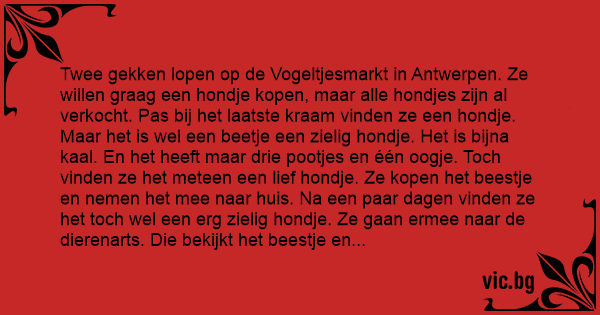 Twee gekken lopen op de Vogeltjesmarkt in Antwerpen. Ze willen graag een hondje kopen, maar alle hondjes zijn al verkocht. Pas bij het laatste kraam vinden ze een hondje. Maar het is wel een beetje een zielig hondje. Het is bijna kaal. En het heeft maar drie pootjes en één oogje. Toch vinden ze het meteen een lief hondje. Ze kopen het beestje en nemen het mee naar huis. Na een paar dagen vinden ze het toch wel een erg zielig hondje. Ze gaan ermee naar de dierenarts. Die bekijkt het beestje en zegt, "Tja, ik denk toch dat 'ie moet worden afgemaakt."