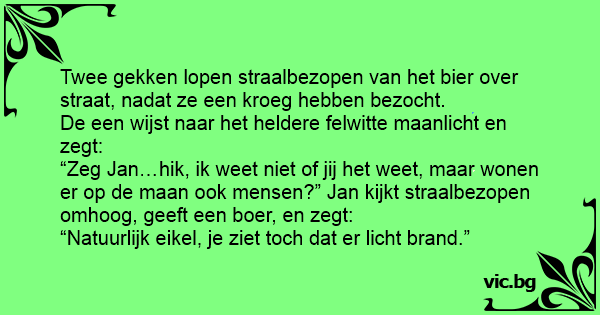 “Zeg Jan…hik, ik weet niet of jij het weet, maar wonen er op de maan ook mensen?” Jan kijkt straalbezopen omhoog, geeft een boer, en zegt: