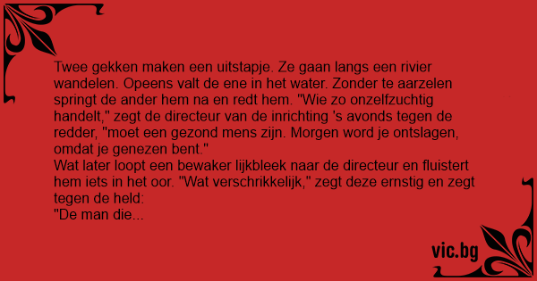 Twee gekken maken een uitstapje. Ze gaan langs een rivier wandelen. Opeens valt de ene in het water. Zonder te aarzelen springt de ander hem na en redt hem. "Wie zo onzelfzuchtig handelt," zegt de directeur van de inrichting 's avonds tegen de redder, "moet een gezond mens zijn. Morgen word je ontslagen, omdat je genezen веnт."