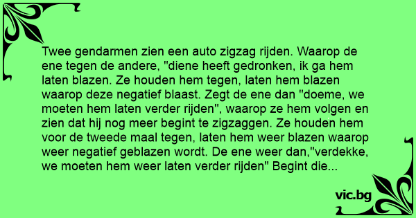 Twee gendarmen zien een auto zigzag rijden. Waarop de ene tegen de andere, "diene heeft gedronken, ik ga hem laten blazen. Ze houden hem tegen, laten hem blazen waarop deze negatief blaast. Zegt de ene dan "doeme, we moeten hem laten verder rijden", waarop ze hem volgen en zien dat hij nog meer begint te zigzaggen. Ze houden hem voor de tweede maal tegen, laten hem weer blazen waarop weer negatief geblazen wordt. De ene weer dan,"verdekke, we moeten hem weer laten verder rijden" Begint die toch weer zeer gevaarlijk te zigzaggen! Ze houden hem dan voor de derde maal tegen waarop de ene dan vraagt :