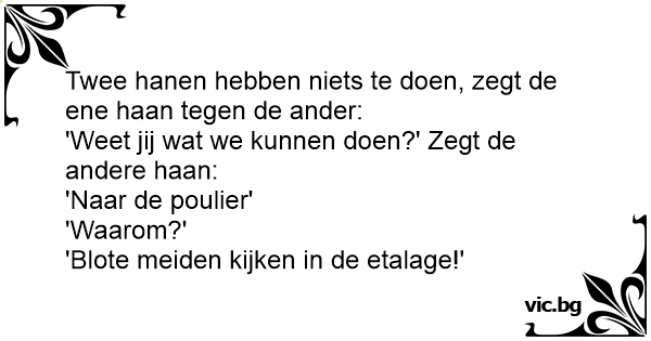 Twee hanen hebben niets te doen, zegt de ene haan tegen de ander: