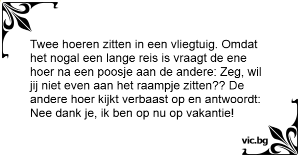 Twee hoeren zitten in een vliegtuig. Omdat het nogal een lange reis is vraagt de ene hоеr na een poosje aan de andere: Zeg, wil jij niet even aan het raampje zitten?? De andere hоеr kijkt verbaast op en antwoordt: Nee dank je, ik ben op nu op vakantie!