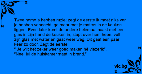 Twee homo´s hebben ruzie: zegt de eerste ik moet niks van je hebben vannacht, ga maar met je matras in de keuken liggen. Even later komt de andere helemaal naakt met een glas in zijn hand de keuken in, stapt over hem heen, vult zijn glas met water en gaat weer weg. Dit gaat een paar keer zo door. Zegt de eerste: