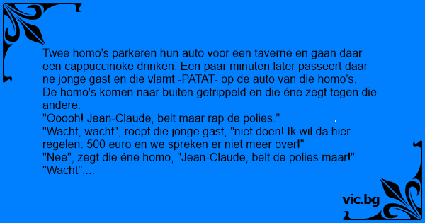 Twee hомо's parkeren hun auto voor een taverne en gaan daar een cappuccinoke drinken. Een paar minuten later passeert daar ne jonge gast en die vlamt -PATAT- op de auto van die hомо's.
