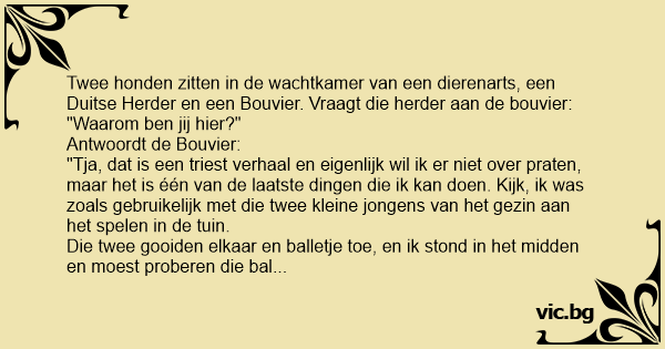 Tre hundar sitter i väntrummet hos veterinären. Det är alldeles tyst då en av hundarna försöker lätta upp stämningen genom att fråga en annan hund: - Varför är du här? Den andra hunden svarar...