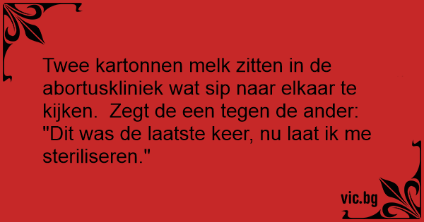 Twee kartonnen melk zitten in de abortuskliniek wat sip naar elkaar te kijken. Zegt de een tegen de ander:
