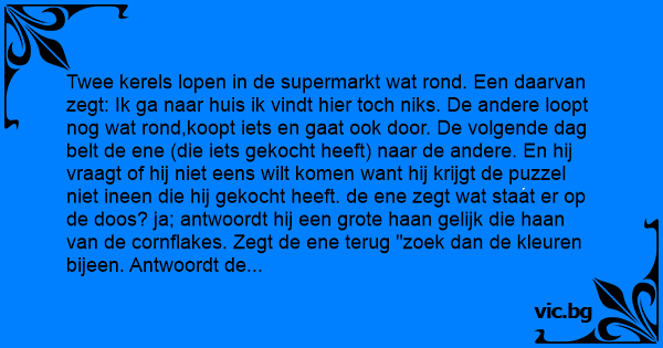 Twee kerels lopen in de supermarkt wat rond. Een daarvan zegt: Ik ga naar huis ik vindt hier toch niks. De andere loopt nog wat rond,koopt iets en gaat ook door. De volgende dag belt de ene (die iets gekocht heeft) naar de andere. En hij vraagt of hij niet eens wilt komen want hij krijgt de puzzel niet ineen die hij gekocht heeft. de ene zegt wat staat er op de dооs? ja; antwoordt hij een grote haan gelijk die haan van de cornflakes. Zegt de ene terug "zoek dan de kleuren bijeen. Antwoordt de anderenat is het hem juist er zijn geen kleuren! wacht zegt de ene ik kom eens af. Als hij binnenkomt vraagt hij waar de puzzel ligt. waarop de andere antwoordt :op de keukentafel. de ene gaat er naar toe en roept : doe de cornflakes in de dооs en we spreken er niet meer over.