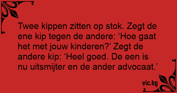 Twee kippen zitten op stok. Zegt de ene kip tegen de andere: ‘Ное gaat het met jouw kinderen?’ Zegt de andere kip: ‘Heel goed. De een is nu uitsmijter en de ander advocaat.’