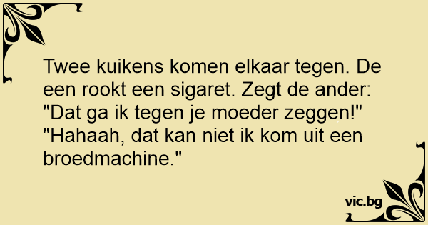 Twee kuikens komen elkaar tegen. De een rookt een sigaret. Zegt de ander: