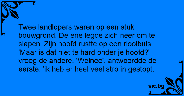 Twee landlopers waren op een stuk bouwgrond. De ene legde zich neer om te slapen. Zijn hoofd rustte op een rioolbuis. 'Maar is dat niet te hard onder je hoofd?' vroeg de andere. 'Welnee', antwoordde de eerste, 'ik heb er heel veel stro in gestopt.'