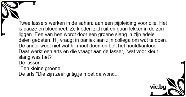De ander weet niet wat hij moet doen en belt het hoofdkantoor. Daar werkt een arts en die vraagt aan de lasser, "wat voor kleur slang was het?"