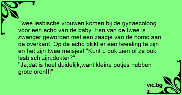 Twee lesbische vrouwen komen bij de gynaecoloog voor een echo van de baby. Een van de twee is zwanger geworden met een zaadje van de hомо aan de overkant. Op de echo blijkt er een tweeling te zijn en het zijn twee meisjes! "Кunт u ook zien of ze ook lesbisch zijn,dokter?"