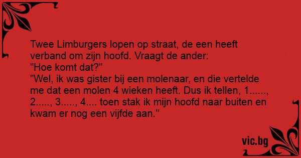 Twee Limburgers lopen op straat, de een heeft verband om zijn hoofd. Vraagt de ander: