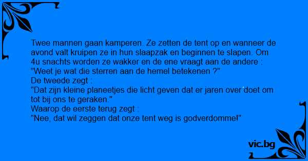 Sherlock Holmes en zij assistent dr. Watson zitten op een camping. Zegt Sherlock ineens: "Kijk eens naar boven en zeg me wat ziet. Redeneer, formuleer en concludeer!" . Dus dr. Watson kijkt omhoog...