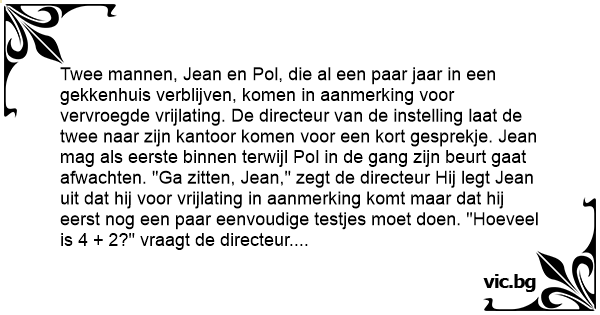 Twee mannen, Jean en Pol, die al een paar jaar in een gekkenhuis verblijven, komen in aanmerking voor vervroegde vrijlating. De directeur van de instelling laat de twee naar zijn kantoor komen voor een kort gesprekje. Jean mag als eerste binnen terwijl Pol in de gang zijn beurt gaat afwachten. "Ga zitten, Jean," zegt de directeur Hij legt Jean uit dat hij voor vrijlating in aanmerking komt maar dat hij eerst nog een paar eenvoudige testjes moet doen. "Hoeveel is 4 + 2?" vraagt de directeur. Jean onmiddellijk: