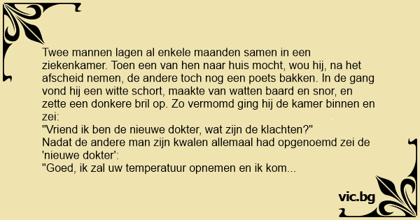 Twee mannen lagen al enkele maanden samen in een ziekenkamer. Toen een van hen naar huis mocht, wou hij, na het afscheid nemen, de andere toch nog een poets bakken. In de gang vond hij een witte schort, maakte van watten baard en snor, en zette een donkere bril op. Zo vermomd ging hij de kamer binnen en zei: