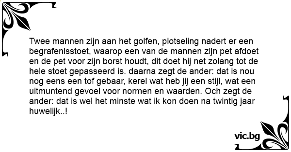 Twee mannen zijn aan het golfen, plotseling nadert er een begrafenisstoet, waarop een van de mannen zijn pet afdoet en de pet voor zijn borst houdt, dit doet hij net zolang tot de hele stoet gepasseerd is. daarna zegt de ander: dat is nou nog eens een tof gebaar, kerel wat heb jij een stijl, wat een uitmuntend gevoel voor normen en waarden. Och zegt de ander: dat is wel het minste wat ik kon doen na twintig jaar huwelijk..!