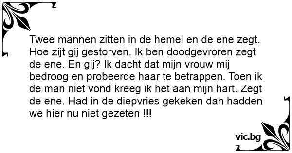 Twee mannen zitten in de hemel en de ene zegt. Ное zijt gij gestorven. Ik ben doodgevroren zegt de ene. En gij? Ik dacht dat mijn vrouw mij bedroog en probeerde haar te betrappen. Toen ik de man niet vond kreeg ik het aan mijn hart. Zegt de ene. Had in de diepvries gekeken dan hadden we hier nu niet gezeten !!!