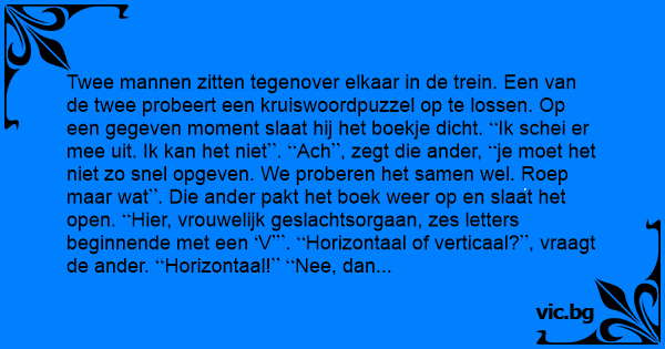 Twee mannen zitten tegenover elkaar in de trein. Een van de twee probeert een kruiswoordpuzzel op te lossen. Op een gegeven moment slaat hij het boekje dicht. Ik schei er mee uit. Ik kan het niet. Ach, zegt die ander, je moet het niet zo snel opgeven. We proberen het samen wel. Roep maar wat. Die ander pakt het boek weer op en slaat het open. Hier, vrouwelijk geslachtsorgaan, zes letters beginnende met een V. Horizontaal of verticaal?, vraagt de ander. Horizontaal! Nee, dan weet ik het ook niet.