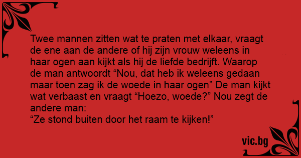 Twee mannen zitten wat te praten met elkaar, vraagt de ene aan de andere of hij zijn vrouw weleens in haar ogen aan kijkt als hij de liefde bedrijft. Waarop de man antwoordt “Nou, dat heb ik weleens gedaan maar toen zag ik de woede in haar ogen” De man kijkt wat verbaast en vraagt “Hoezo, woede?” Nou zegt de andere man: