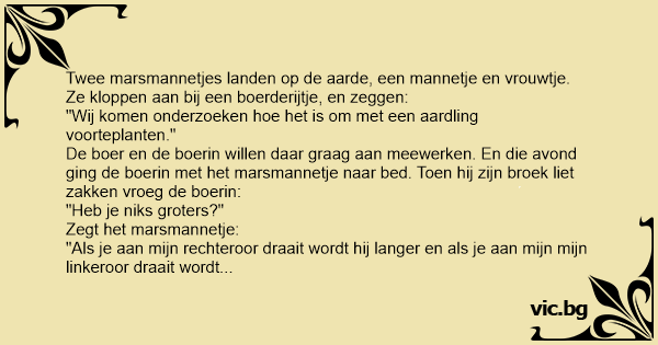 "Als je aan mijn rechteroor draait wordt hij langer en als je aan mijn mijn linkeroor draait wordt hij dikker." De volgende morgen vertelt de boerin aan de boer dat ze een fantastische nacht heeft gehad en vroeg hое het bij hem was gegaan. "Nou", zegt de boer, "het was eigenlijk niet zo fijn, dat marsvrouwtje zat de hele tijd aan mijn oren te draaien."