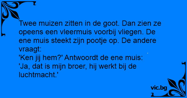 Twee muizen zitten in de goot. Dan zien ze opeens een vleermuis voorbij vliegen. De ene muis steekt zijn pootje op. De andere vraagt: