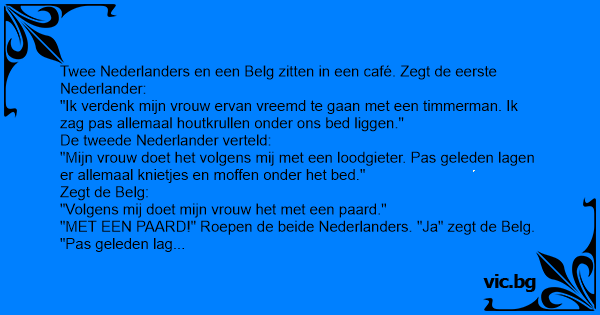 "MET EEN PAARD!" Roepen de beide Nederlanders. "Ja" zegt de Belg. "Pas geleden lag er een ruiter onder mijn bed"