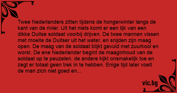 Twee Nederlanders zitten tijdens de hongerwinter langs de kant van de rivier. Uit het niets komt er een lijk van een dikke Duitse soldaat voorbij drijven. De twee mannen vissen met moeite de Duitser uit het water, en snijden zijn maag open. De maag van de soldaat blijkt gevuld met zuurkool en worst. De ene Nederlander begint de maaginhoud van de soldaat op te peuzelen, de andere kijkt onsmakelijk toe en zegt er totaal geen trek in te hebben. Enige tijd later voelt de man zich niet goed en kotst de zuurkool met worst weer uit. Direct begint de andere man het op te eten. “Ik dacht dat je geen zuurkool met worst moest hebben?” zegt de ene man verbaast.