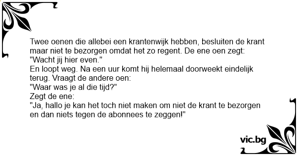 Twee oenen die allebei een krantenwijk hebben, besluiten de krant maar niet te bezorgen omdat het zo regent. De ene oen zegt: