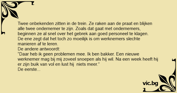 Twee onbekenden zitten in de trein. Ze raken aan de praat en blijken alle twee ondernemer te zijn. Zoals dat gaat met ondernemers, beginnen ze al snel over het gebrek aan goed personeel te klagen.