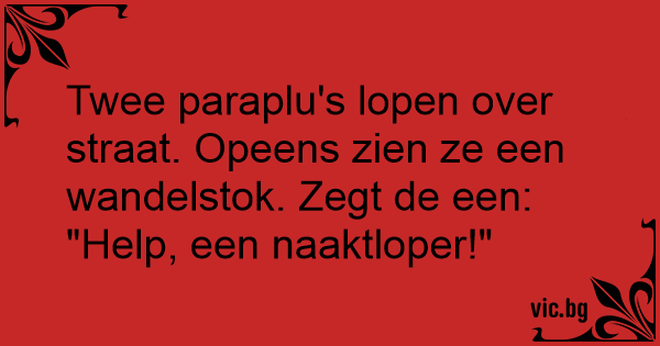 Twee paraplu's lopen over straat. Opeens zien ze een wandelstok. Zegt de een: