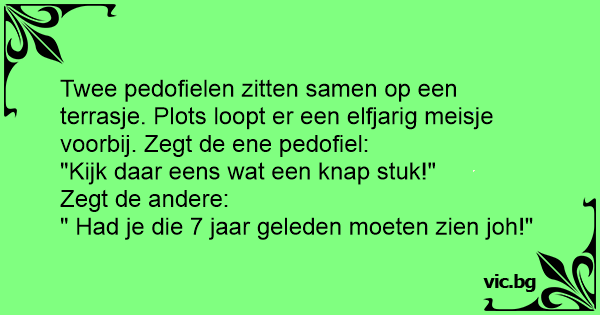 Twee pedofielen zitten samen op een terrasje. Plots loopt er een elfjarig meisje voorbij. Zegt de ene pedofiel: "Kijk daar eens wat een knap stuk!" Zegt de andere: " Had je die 7 jaar geleden moeten zien joh!"