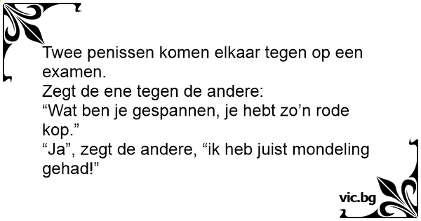 “Ja”, zegt de andere, “ik heb juist mondeling gehad!”