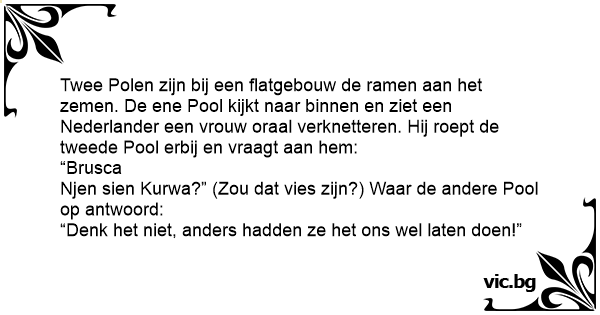 Njen sien Kurwa?” (Zou dat vies zijn?) Waar de andere Pool op antwoord: