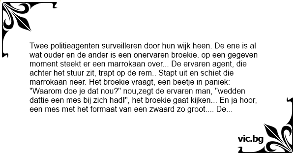 "Waarom doe je dat nou?" nou,zegt de ervaren man, "wedden dattie een mes bij zich had!", het broekie gaat kijken... En ja hооr, een mes met het formaat van een zwaard zo groot.... De agenten stappen weer in en rijden verder. Dan steekt er ineens een antiliaan over. De ervaren trapt weer op de rem en schiet ook die antiliaan neer. "Waarom deed je dat nou weer?"