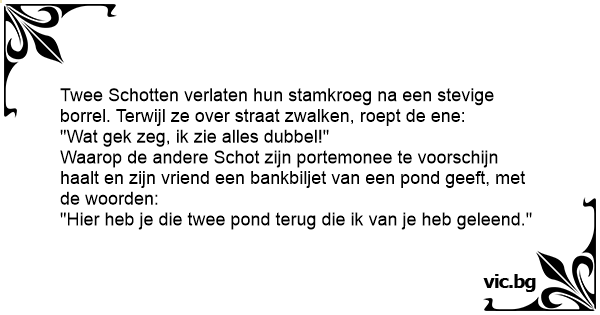 Waarop de andere Schot zijn portemonee te voorschijn haalt en zijn vriend een bankbiljet van een pond geeft, met de woorden:
