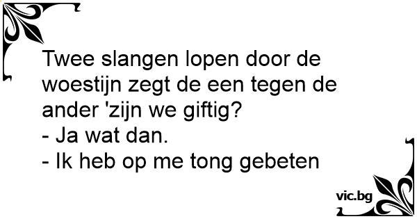 Er lopen twee slangen door de woestijn. Zegt de ene: "Zijn wij giftig?" Zegt de ander: "Hoezo?" "Nou, ik heb net op Mijn tong gebeten."