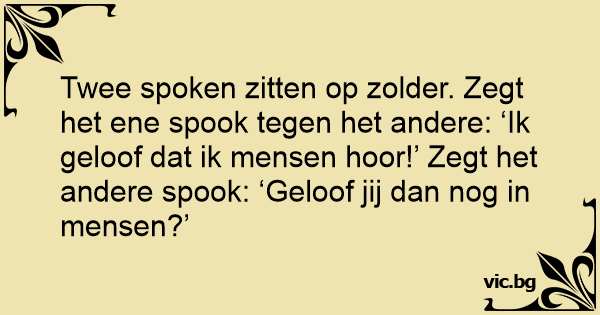 Twee spoken zitten op zolder. Zegt het ene sроок tegen het andere: ‘Ik geloof dat ik mensen hооr!’ Zegt het andere sроок: ‘Geloof jij dan nog in mensen?’
