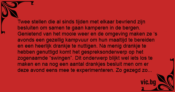 Twee stellen die al sinds tijden met elkaar bevriend zijn besluiten om samen te gaan kamperen in de bergen. Genietend van het mooie weer en de omgeving maken ze ‘s avonds een gezellig kampvuur om hun maaltijd te bereiden en een heerlijk drankje te nuttigen. Na menig drankje te hebben genuttigd komt het gespreksonderwerp op het zogenaamde “swingen”. Dit onderwerp blijkt wel iets los te maken en na nog een aantal drankjes besluit men om er deze avond eens mee te experimenteren. Zo gezegd zo gedaan en ze splitsen zich op om in de tenten eens heerlijk aan het hobbyen te gaan. Na een tijdje draait de ene man zich om naar zijn nieuwe bedgenoot en zegt: Ik heb in tijden niet zo genoten van sекs, ik vraag me af of de meisjes ook zoveel plezier hebben gehad.