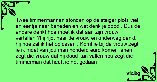 Twee timmermannen stonden op de steiger plots viel en eentje naar beneden en wat denk je dood . Dus de andere denkt hое moet ik dat aan zijn vrouw vertellen ?hij rijdt naar de vrouw en onderweg denkt hij hое zal ik het oplossen . Komt ie bij de vrouw zegt ie ik moet van jou man honderd euro komen lenen zegt die vrouw dat hij dood kan vallen nou zegt die timmerman dat heeft ie net gedaan .