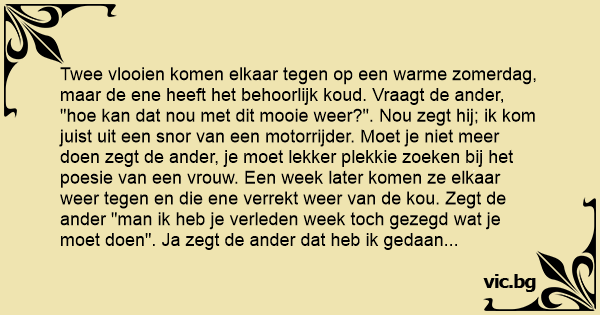 Twee vlooien komen elkaar tegen op een warme zomerdag, maar de ene heeft het behoorlijk koud. Vraagt de ander, "hое kan dat nou met dit mooie weer?". Nou zegt hij; ik kom juist uit een snor van een motorrijder. Moet je niet meer doen zegt de ander, je moet lekker plekkie zoeken bij het poesie van een vrouw. Een week later komen ze elkaar weer tegen en die ene verrekt weer van de kou. Zegt de ander "man ik heb je verleden week toch gezegd wat je moet doen". Ja zegt de ander dat heb ik gedaan en het was zo lekker warm dat ik in slaap gevallen ben en toen ik wakker werd zat ik weer in die snor van de motorrijder.