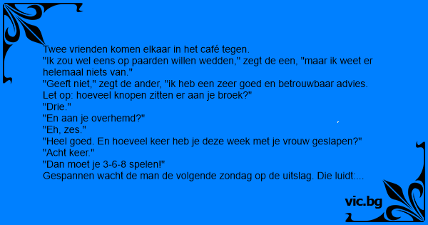"Ik zou wel eens op paarden willen wedden," zegt de een, "maar ik weet er helemaal niets van."
