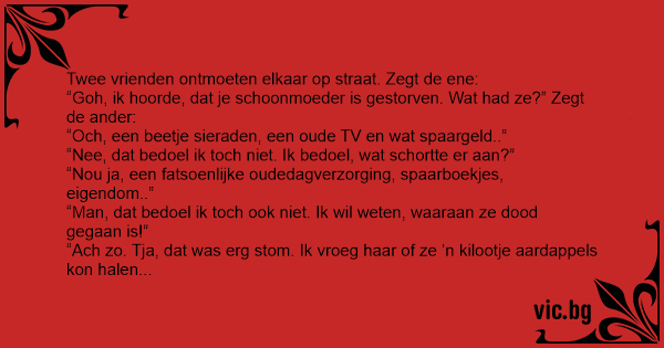 “Goh, ik hoorde, dat je schoonmoeder is gestorven. Wat had ze?” Zegt de ander: