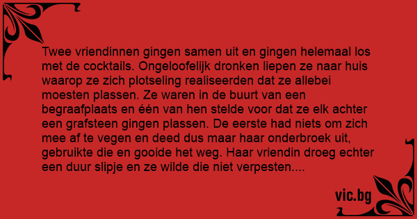 Twee vriendinnen gingen samen uit en gingen helemaal los met de cocktails. Ongeloofelijk dronken liepen ze naar huis waarop ze zich plotseling realiseerden dat ze allebei moesten plassen. Ze waren in de buurt van een begraafplaats en één van hen stelde voor dat ze elk achter een grafsteen gingen plassen. De eerste had niets om zich mee af te vegen en deed dus maar haar onderbroek uit, gebruikte die en gooide het weg. Haar vriendin droeg echter een duur slipje en ze wilde die niet verpesten. Maar gelukkig lag daar bij haar een grote strik van een krans dat op een graf lag en veegde zichzelf daarmee af. Nadat ze hun behoeften hadden gedaan, gingen ze weer verder naar huis. De volgende dag belde de echtgenoten van beide vrouwen elkaar op en de eerste zei: