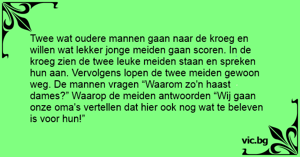 Twee wat oudere mannen gaan naar de kroeg en willen wat lekker jonge meiden gaan scoren. In de kroeg zien de twee leuke meiden staan en spreken hun aan. Vervolgens lopen de twee meiden gewoon weg. De mannen vragen “Waarom zo'n haast dames?” Waarop de meiden antwoorden “Wij gaan onze oma's vertellen dat hier ook nog wat te beleven is voor hun!”
