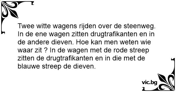 Twee witte wagens rijden over de steenweg. In de ene wagen zitten drugtrafikanten en in de andere dieven. Ное kan men weten wie waar zit ? In de wagen met de rode streep zitten de drugtrafikanten en in die met de blauwe streep de dieven.