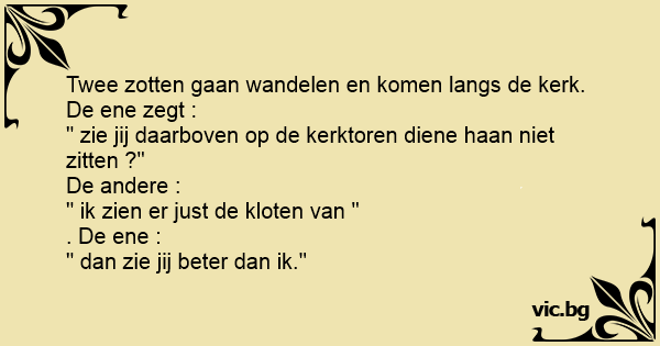 Twee zotten gaan wandelen en komen langs de kerk. De ene zegt :